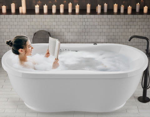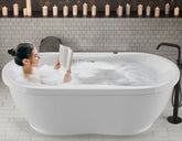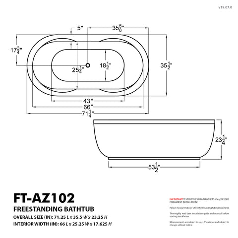 FT-AZ102Transform your bathroom into a luxurious spa retreat with the ANZZI Lori Series 6 ft. Whirlpool and Air Bath Tub in white. This elegant oval freestanding tub blends therapeutic functionality with modern design, creating the perfect centerpiece for your self-care sanctuary. Featuring 18 invigorating air bubble injectors and 12 hydro-massage water jets, this modern bathtub is built to melt away muscle tension and mental stress with every soak. The powerful 1 HP pump and 1 HP air blower ensure a consistent, comforting massage, while the integrated aromatherapy system releases calming fragrances to elevate your bathing ritual; just add your favorite scent (sold separately). Enjoy relaxing soaks with this 53-gallon capacity freestanding bathtub with center drain, which offers deep tub, full-body immersion, while the center drain design ensures efficient water flow and balanced installation. This bathtub for shower features a smooth, high-gloss nonporous surface made of fiberglass-reinforced acrylic that is easy to clean and resistant to stains and fading for lasting beauty. The subtle side inset along the middle edge adds a refined touch of modern elegance, making this air tub a seamless fit for both contemporary and classic bath settings. Whether it's for relaxation, rejuvenation, or recovery, immerse yourself in a bathing experience with the ANZZI 71"x36" stand-alone tub that soothes the body, calms the mind, and redefines everyday luxury.AIR JETTED MASSAGE This bath tub includes 18 Acu-Stream air jets that release streams of air bubbles, providing a gentle yet invigorating aero-therapeutic experience to refresh the entire bodyAROMATHERAPY INFUSION Enhance your bath with aromatic bubbles. This system fills your tub with rich fragrance, offering a spa-like aromatherapy experience that relaxes the mindMAINTENANCE HEATER Built-in maintenance heater helps maintain the bathtub water at a consistent, warm temperature, extending your soaking time without needing to refill with hot waterSIMPLE CONTROLS The stand-alone tub is designed for convenience, featuring raised push buttons and adjustable whirlpool pressure controls for effortless operation and comfort at your fingertipsDURABLE CONSTRUCTION Made from marine-grade acrylic with fiberglass reinforcement, this bath tub boasts a long-lasting, high-gloss finish that resists fading over timeELEGANT FINISH Features a glossy ultra-white acrylic finish with Polished Chrome trim, this modern bathtub blends beauty with function that fits seamlessly into most bathroom designsGENEROUS OVERALL DIMENSIONS Spacious 71.25" L x 35.5" W x 23.25" H freestanding tub, provides ample room to relax and offers a luxurious bathing experienceCOMFORTABLE BASIN SIZE The basin measures 66" L x 25.25" W, allowing for deep soaking comfort and optimal space, making this air bathtub ideal for relaxation and therapeutic benefitsWATER CAPACITY Holds an average of 53 gallons. This bathtub ensures full immersion and a spa-grade experience right at home, ideal for anyone seeking a peaceful moment to rechargeDRAIN & PUMP CONFIGURATION Comes with a center drain and left-side pump location. The drain assembly is included for convenience, while the faucet is sold separately for customizationIAPMO CERTIFIED This high-quality bathtub for shower setups is IAPMO listed, ensuring strict adherence to safety, durability, and standards performanceRELIABLE WARRANTY COVERAGE Comes with a 10-year limited warranty on the tub shell against manufacturer defects, 1-year for parts, and 90 days of labor, ensuring long-term satisfactionCURBSIDE DELIVERY This item is shipped via curbside delivery only; the carrier will unload the tub at your location, but is not responsible for moving it inside your homeShop more ANZZI Bathtubs at The Home Depot to find the best option for your homeChrome Finish Pop -Up Drain is Included (Faucet not included) Specs Sheet Manual Install Guide Care Guide WarrantyFT-AZ102 - ANZZI - Transform your bathroom into a luxurious spa retreat with the ANZZI Lori Series 6 ft. Whirlpool and Air Bath Tub in white. This elegant oval freestanding tub blends therapeutic functionality with modern design, creating the perfect centerpiece for your self-care sanctuary. Featuring 18 invigorating air bubble injectors and 12 hydro-massage water jets, this modern bathtub is built to melt away muscle tension and mental stress with every soak. The powerful 1 HP pump and 1 HP air blower ensure a consistent, comforting massage, while the integrated aromatherapy system releases calming fragrances to elevate your bathing ritual; just add your favorite scent (sold separately). Enjoy relaxing soaks with this 53-gallon capacity freestanding bathtub with center drain, which offers deep tub, full-body immersion, while the center drain design ensures efficient water flow and balanced installation. This bathtub for shower features a smooth, high-gloss nonporous surface made of fiberglass-reinforced acrylic that is easy to clean and resistant to stains and fading for lasting beauty. The subtle side inset along the middle edge adds a refined touch of modern elegance, making this air tub a seamless fit for both contemporary and classic bath settings. Whether it's for relaxation, rejuvenation, or recovery, immerse yourself in a bathing experience with the ANZZI 71"x36" stand-alone tub that soothes the body, calms the mind, and redefines everyday luxury.FT-AZ102 - ANZZI - Transform your bathroom into a luxurious spa retreat with the ANZZI Lori Series 6 ft. Whirlpool and Air Bath Tub in white. This elegant oval freestanding tub blends therapeutic functionality with modern design, creating the perfect centerpiece for your self-care sanctuary. Featuring 18 invigorating air bubble injectors and 12 hydro-massage water jets, this modern bathtub is built to melt away muscle tension and mental stress with every soak. The powerful 1 HP pump and 1 HP air blower ensure a consistent, comforting massage, while the inte